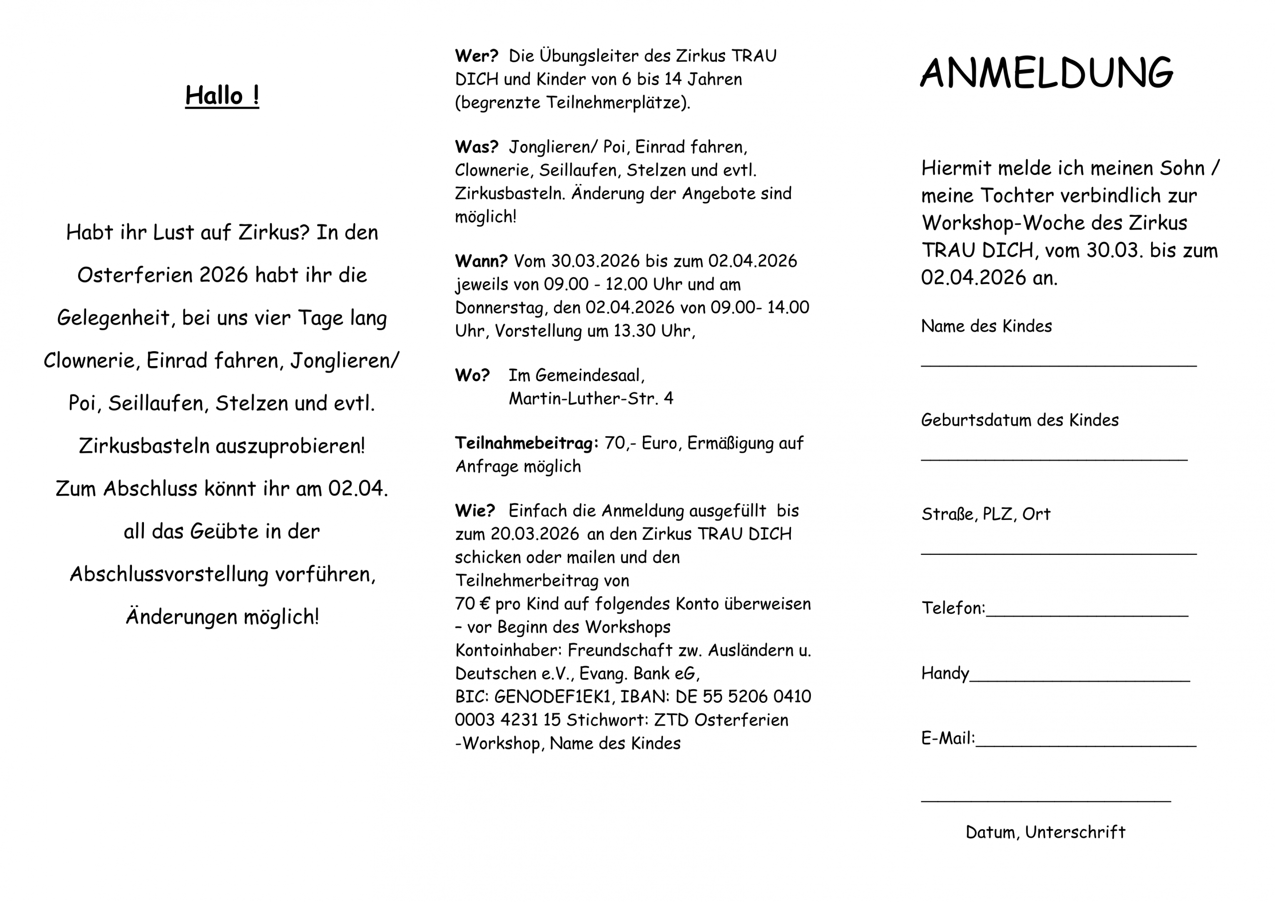 Für die Osterferien 2026 wird gerade ein Zirkus-Workshop vorbereitet. Er findet statt vom 30. März mit 2. April 2026. Die Details gibt es hier unten zum Herunterladen: